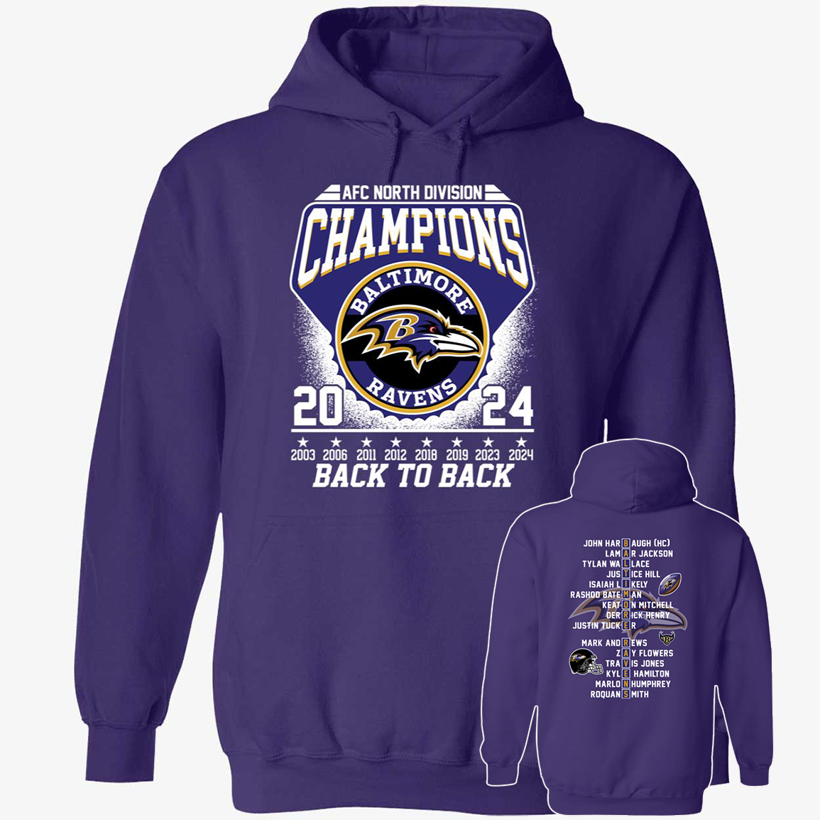 [Front + Back] AFC North Division Champions Baltimore Ravens 2024 Back To Back Shirt